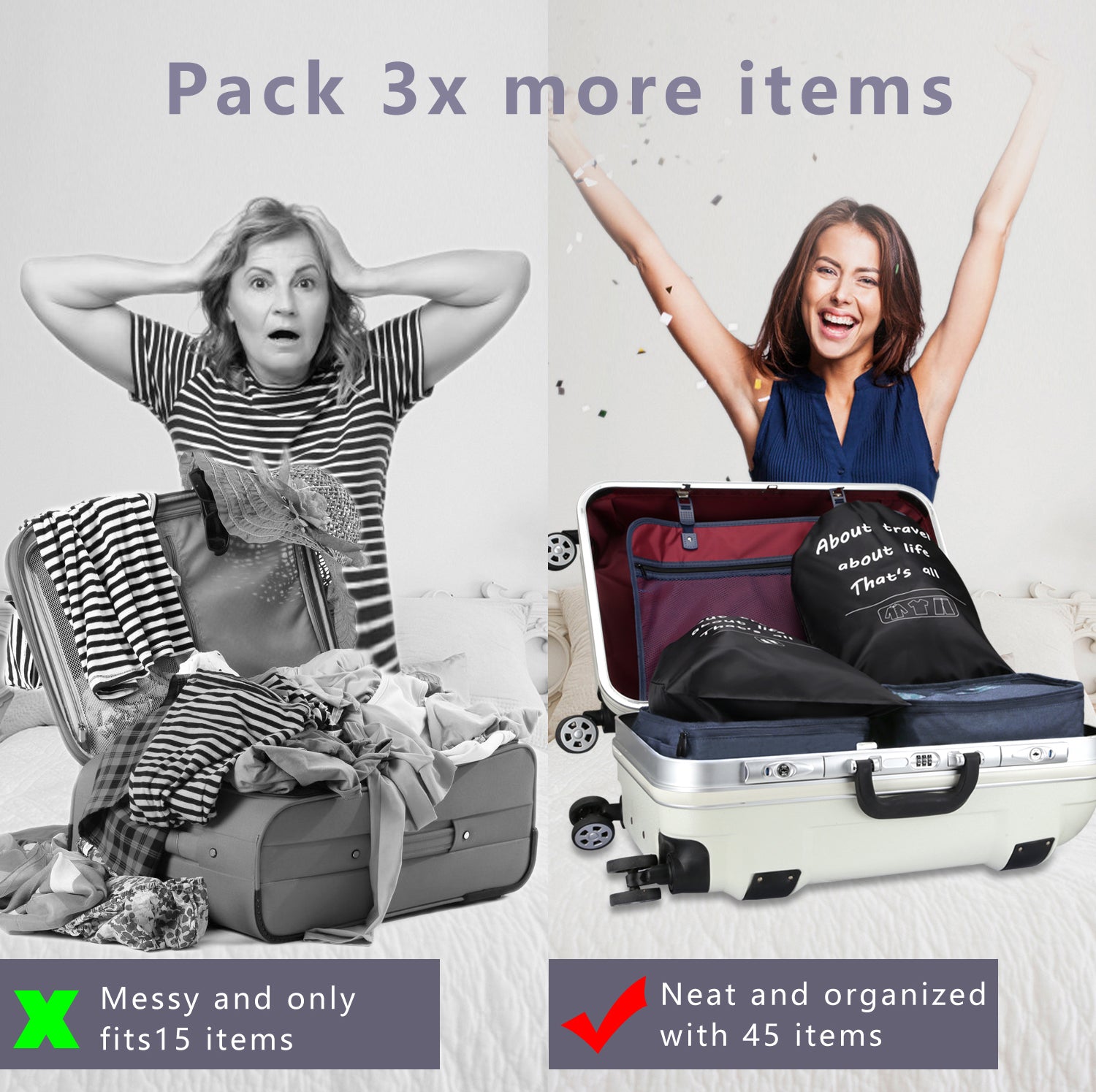 Signature Drawstring Bags: Includes a large, black drawstring pouch featuring the inspirational quote: "About travel / About life / That's all."